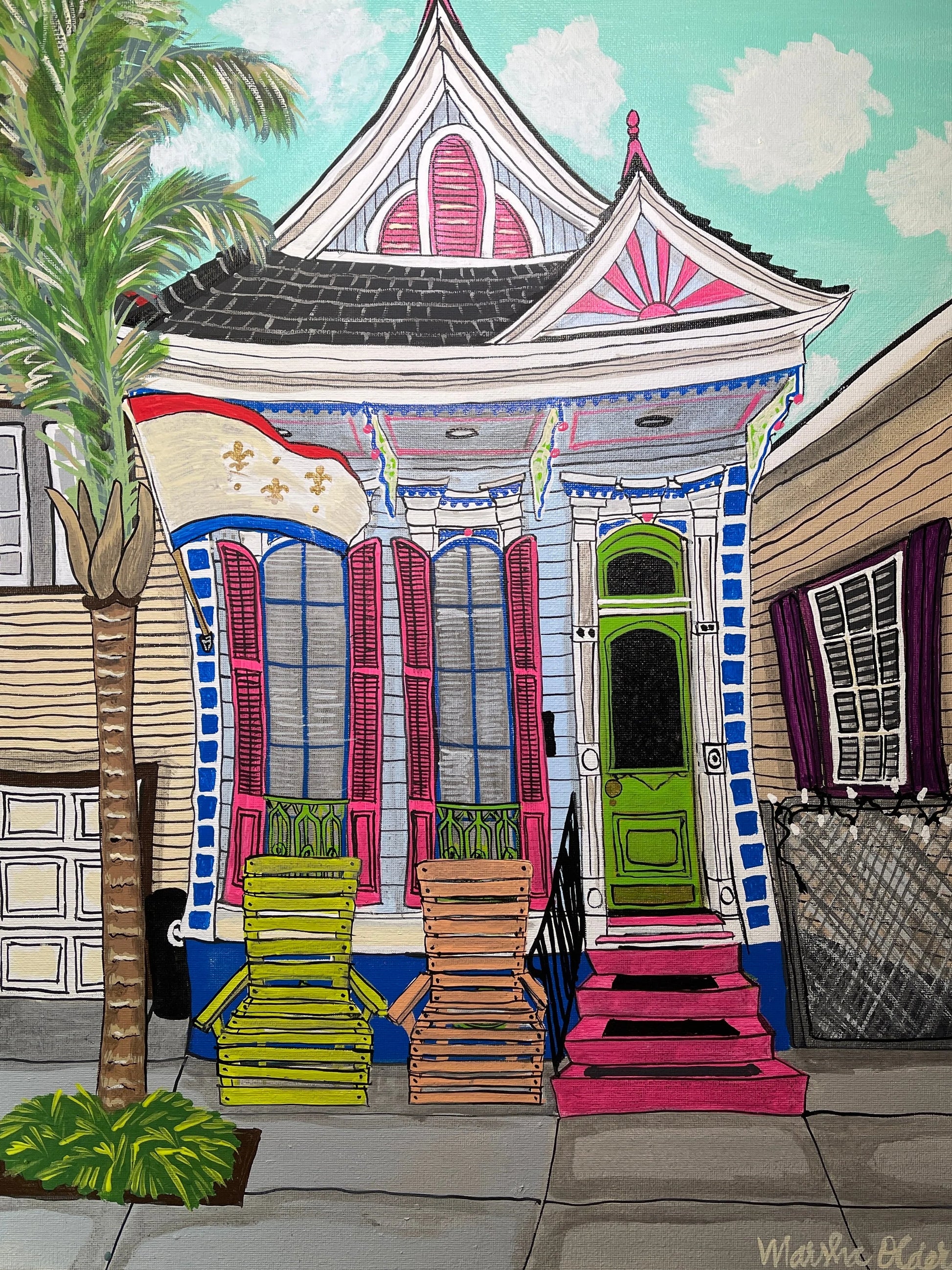 The royal flag and the (somewhat) comfort of two Adirondack chairs. Two gables with two different sets of trim--what's going on here? Dark blue, pinks, red, light green, darker green, white trim? What is going on? You know, it looks great!