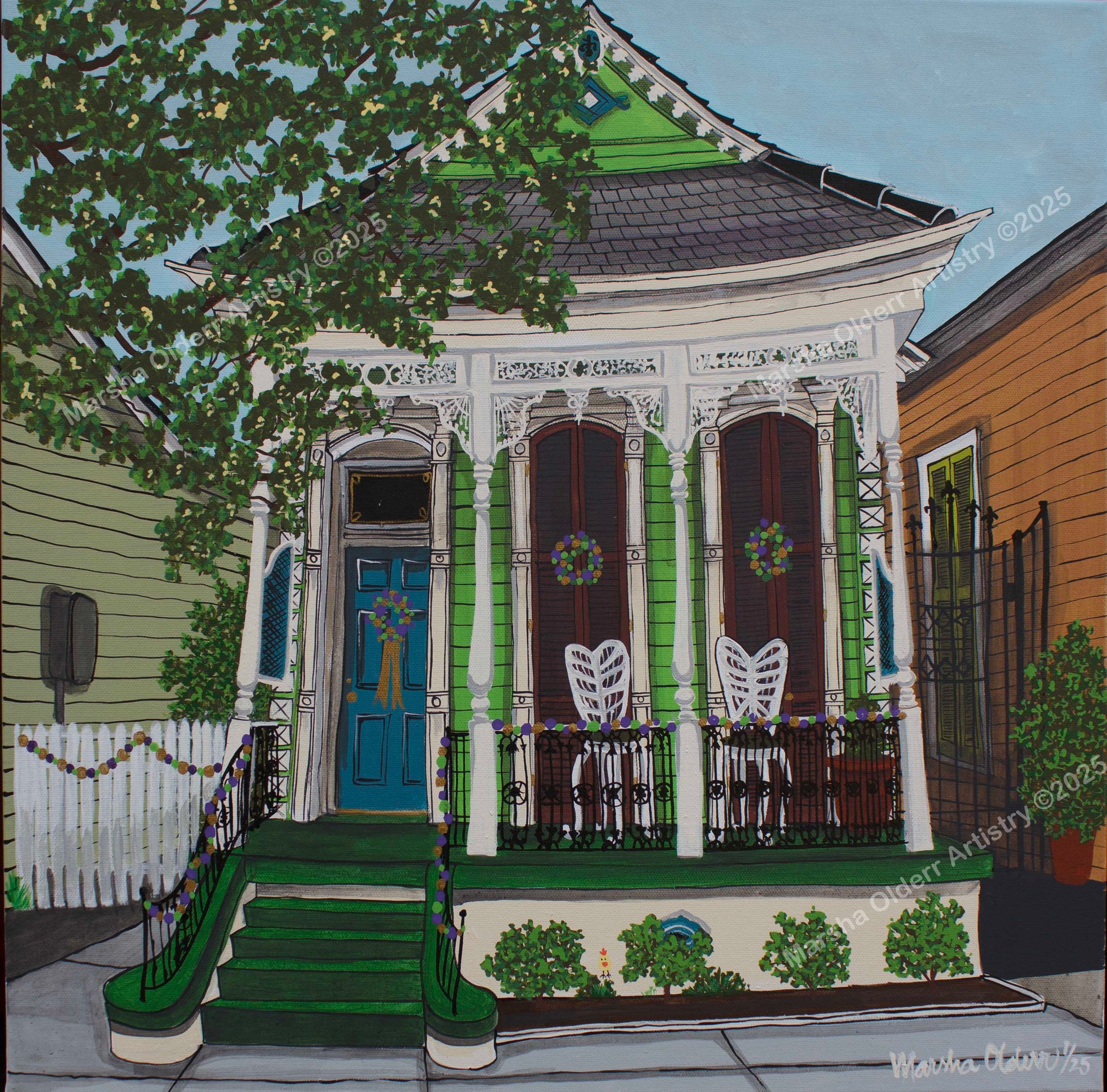 This shotgun is stylish and decorated for the most celebrated holidays of the New Orleans year—Mardi Gras!!! The Apple Green siding is pretty close to the Mardi Gras green. Purple, gold, and green decorations are placed around the exterior of the home. The shotgun home’s woodwork includes elaborate scrolled white woodwork and a diamond-shaped design in the pediment.